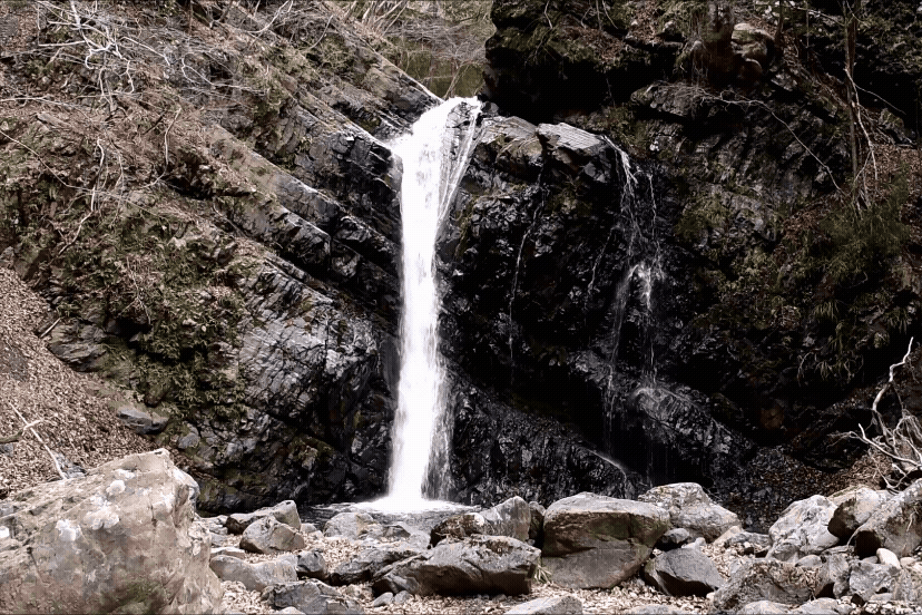 太平洋・駿河湾←富士川←早川←新宮川に落ちる落差12mの滝で、大きく傾いた地層が印象的な滝です。