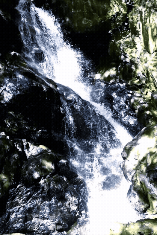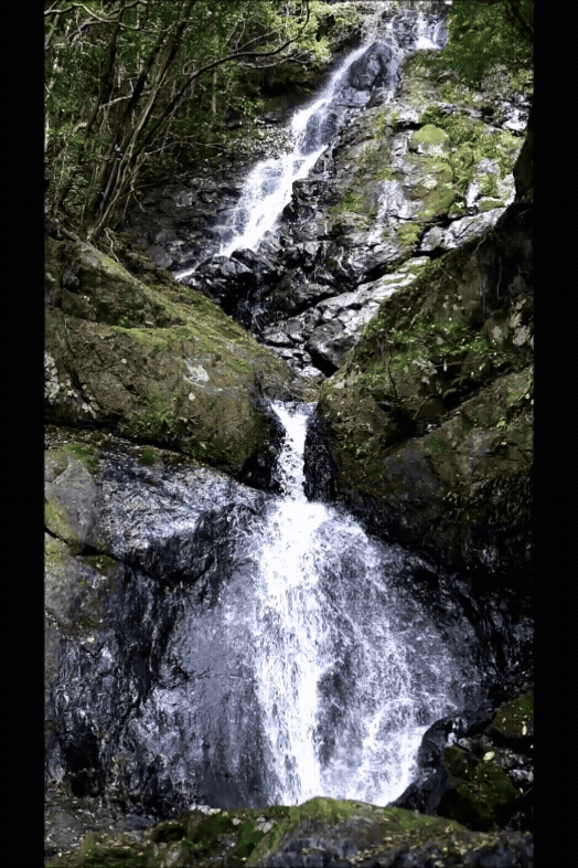 太平洋・土佐湾←伊与木川上流部の轟渓谷に落ちる轟(とどろ)の滝は、落差54mの擂鉢の滝と、落差18mの朝鍋の滝からなります。