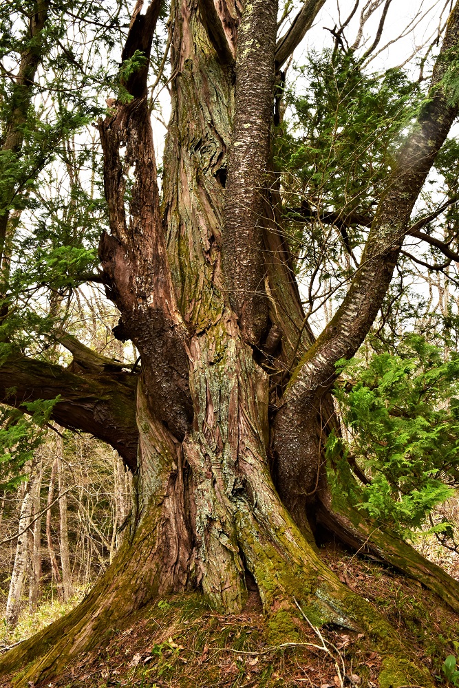サワラ(ヒバ)の根元からカスミザクラが生えたもので、樹齢は約300年だそうです。