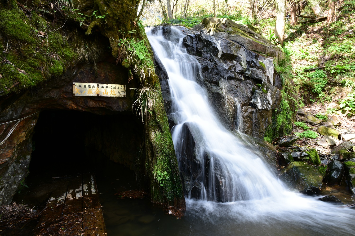 小さな滝ですがすぐ横に金を掘った坑道入口があることが特異なところ。