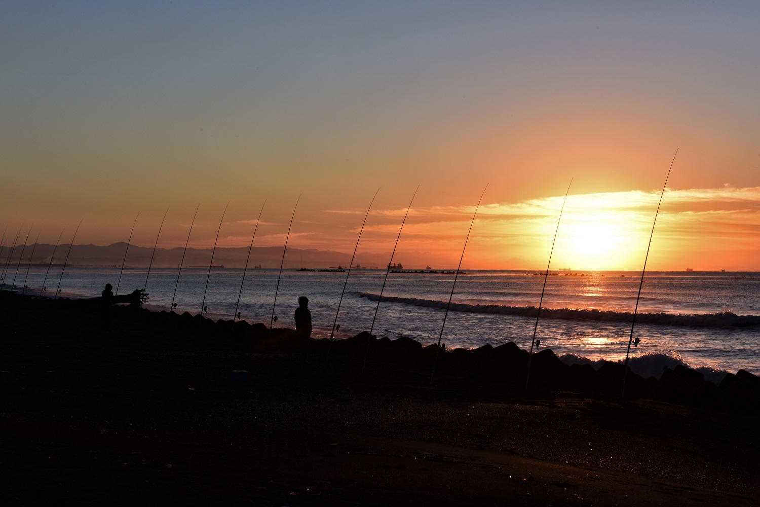 サケ釣りの竿が並ぶ向こうに御来光です。