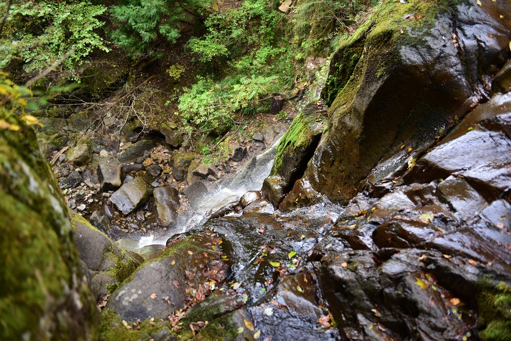 林道をさらに上がって行くと滝の落ち口のすぐ脇を通り、上から覗くのもお手軽な滝でした。