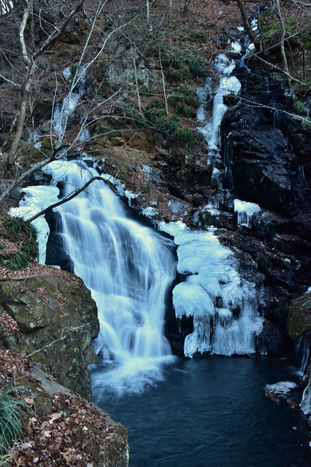 道路から、階段を下りていくと最初に綺麗に分岐した渓流瀑で、ちょっと凍りかけていました。