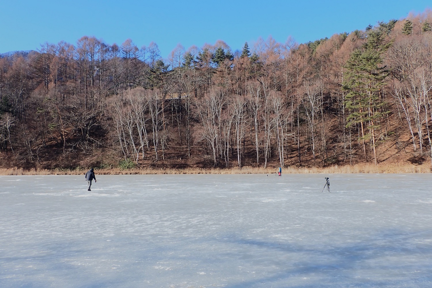 目の前の立岩湖は完全凍結で、朝からワカサギ釣りの方が真ん中あたりまで立ち入って釣りの準備をしていました。