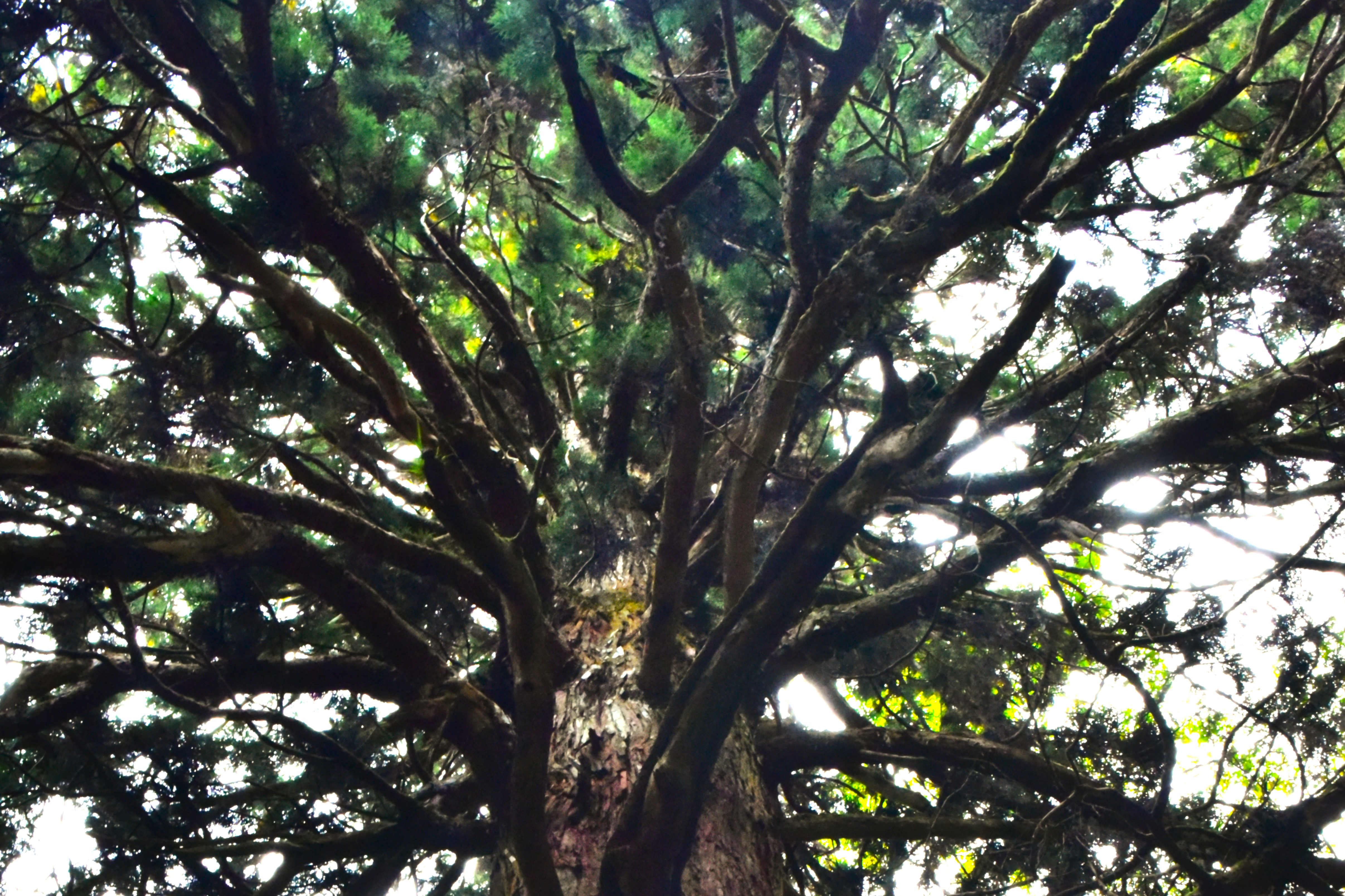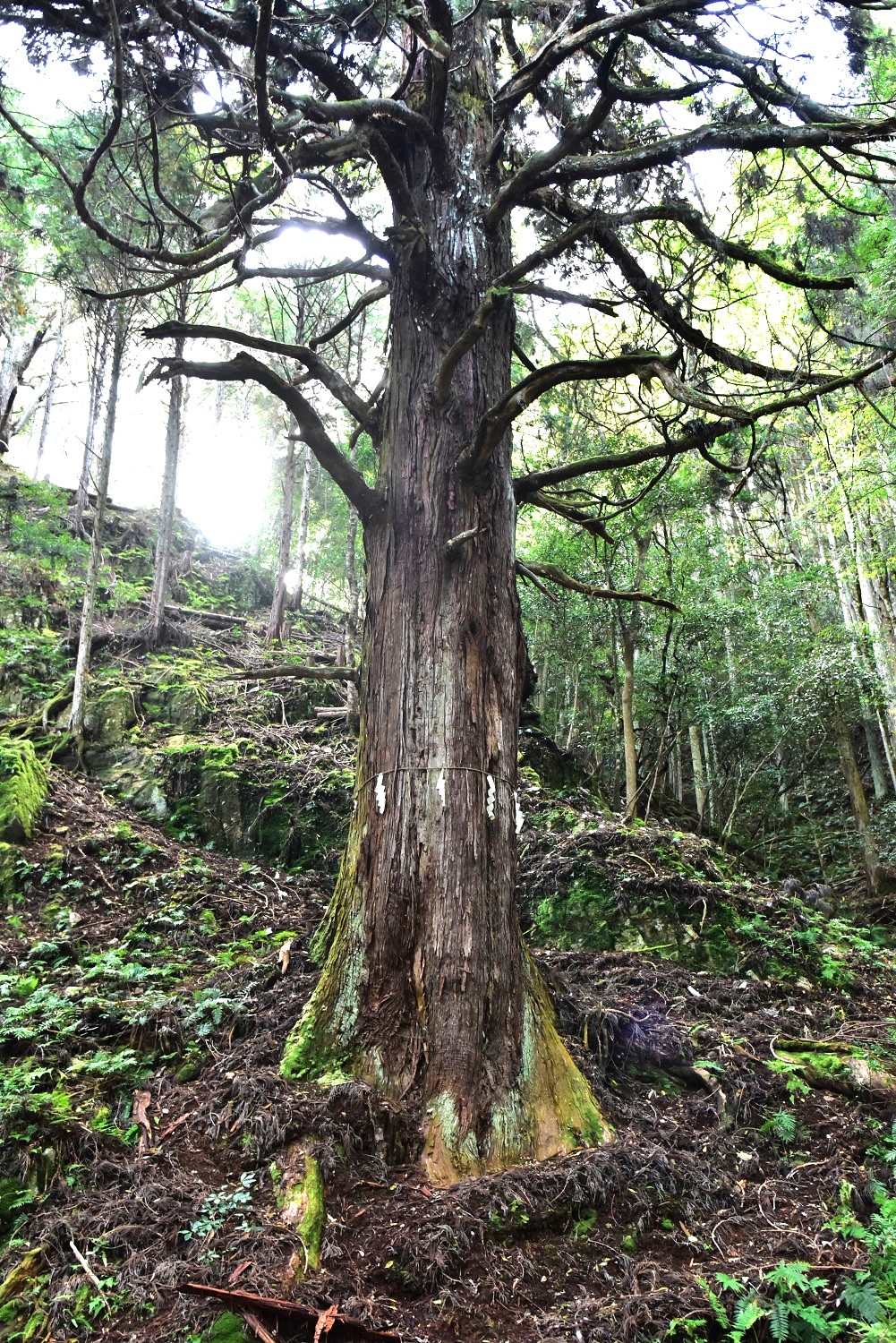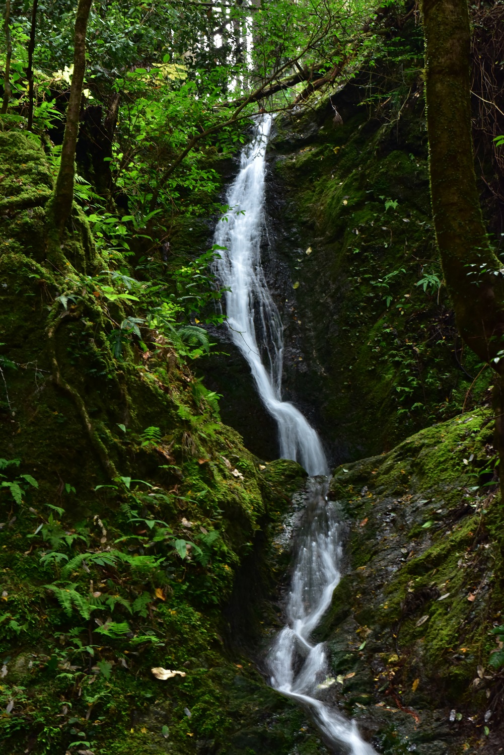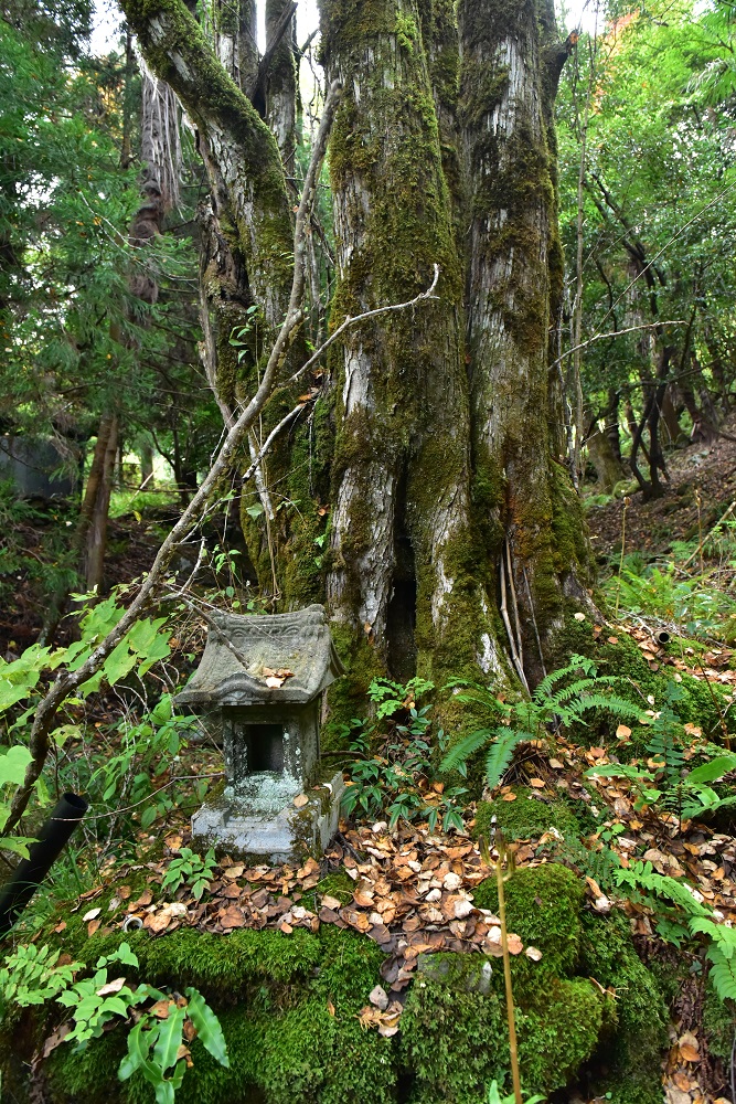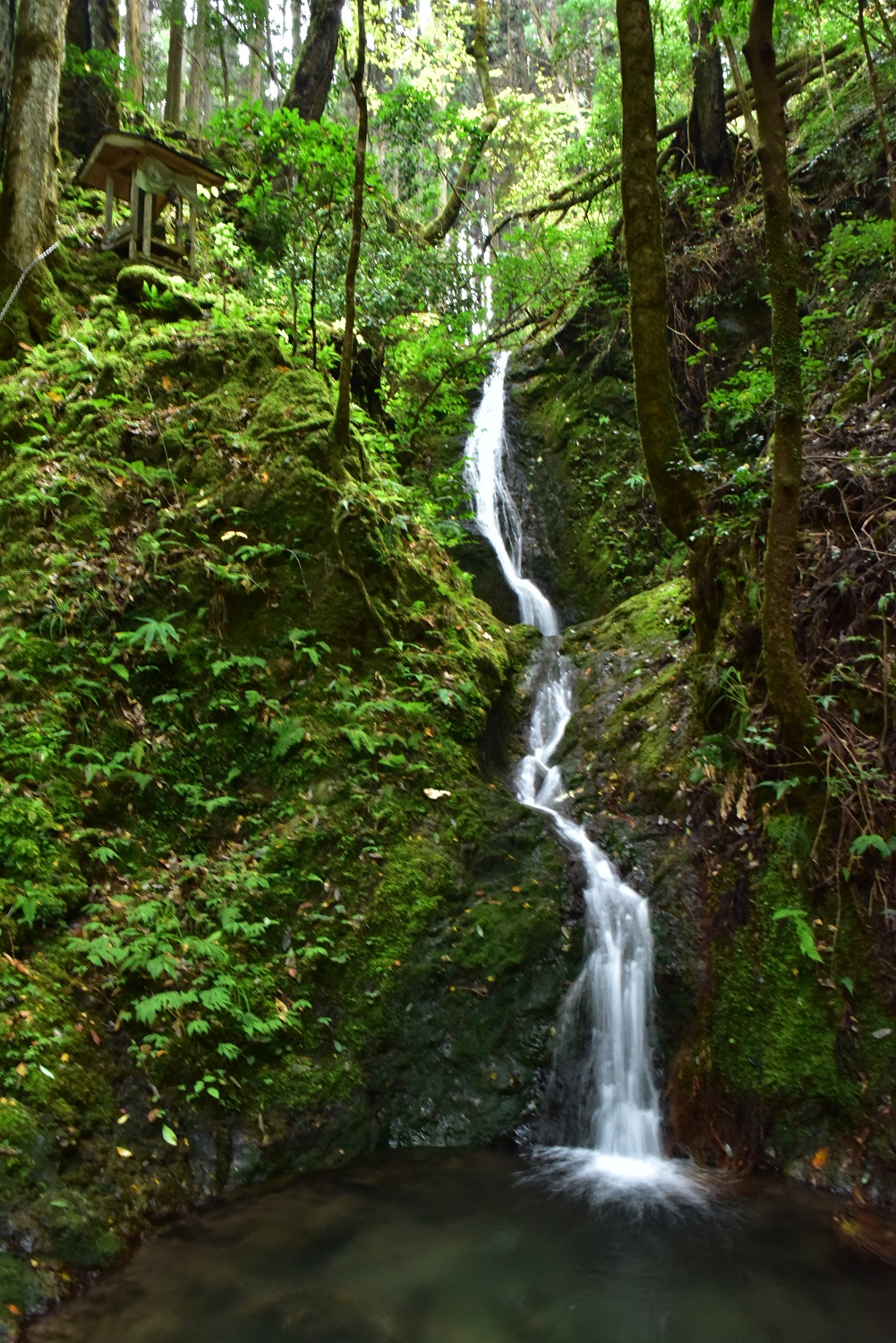 摩氣神社から林道を300mぐらい歩いたでしょうか、滝は大きな杉のご神木の奥に落ちていました。