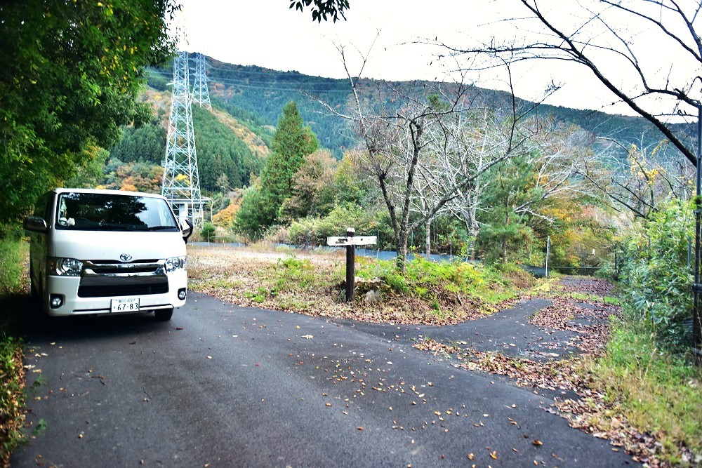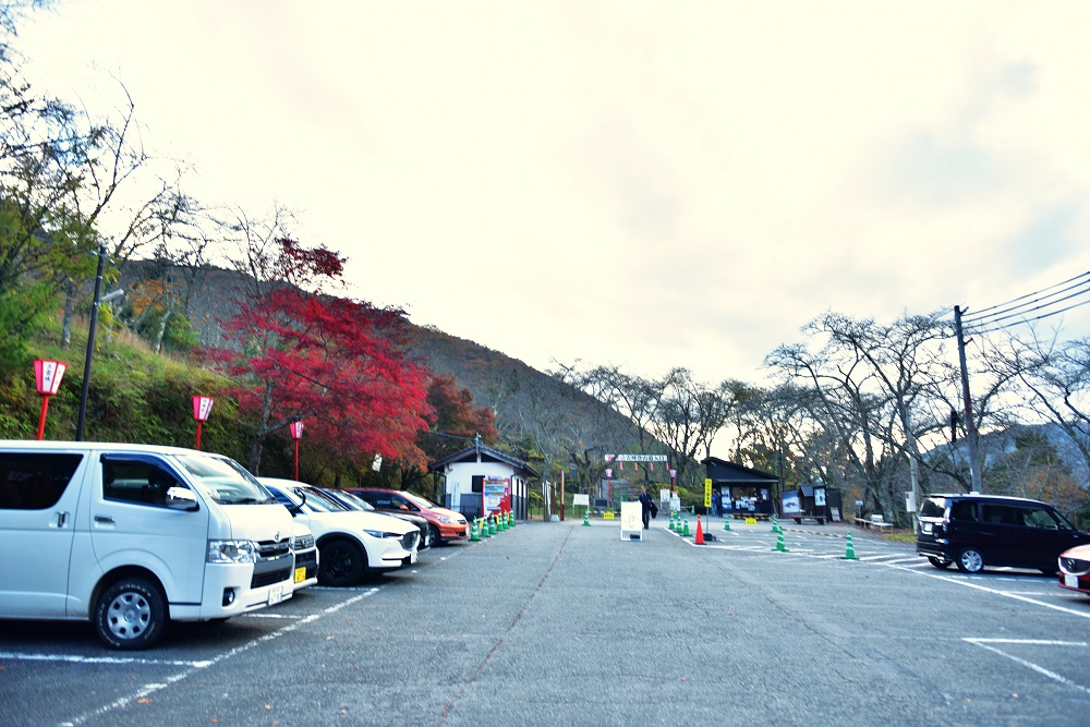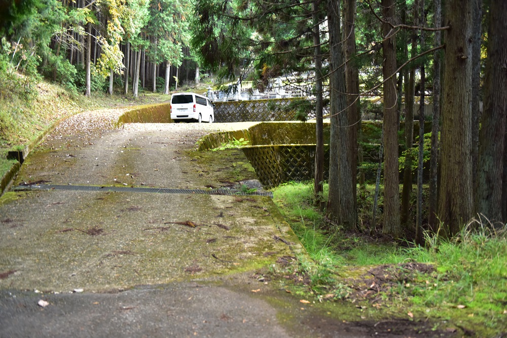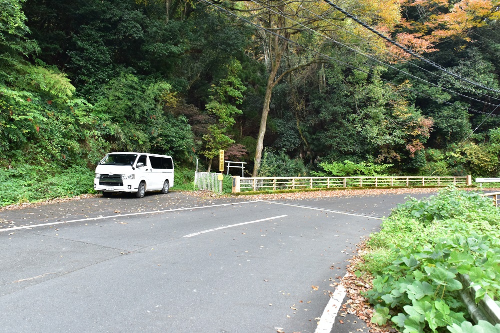 駐車場と滝への入口、奥の柵は自分で開け閉めして入ります。