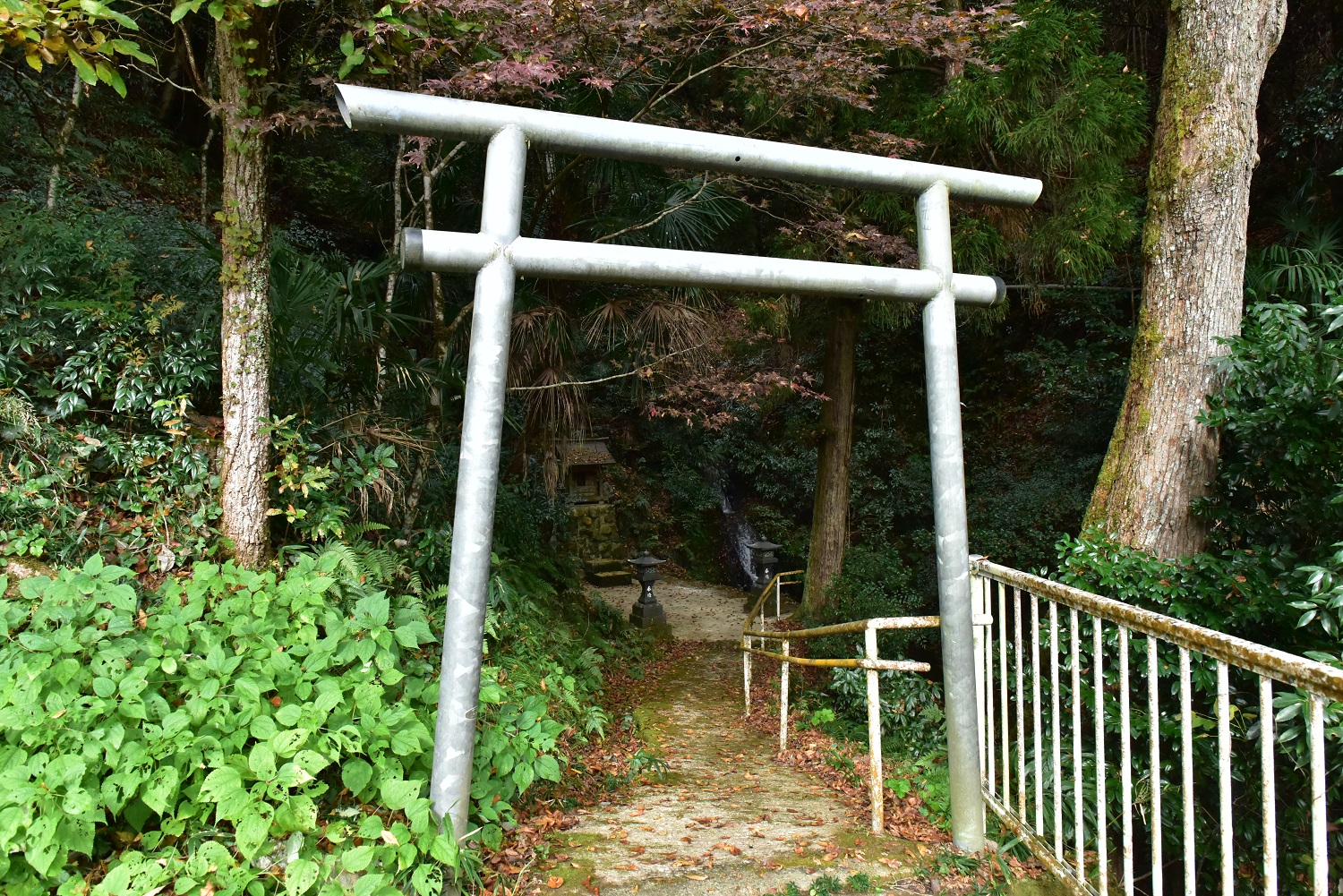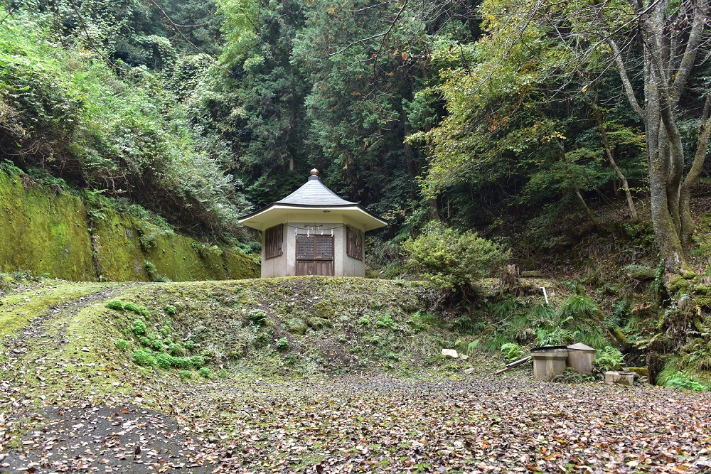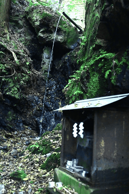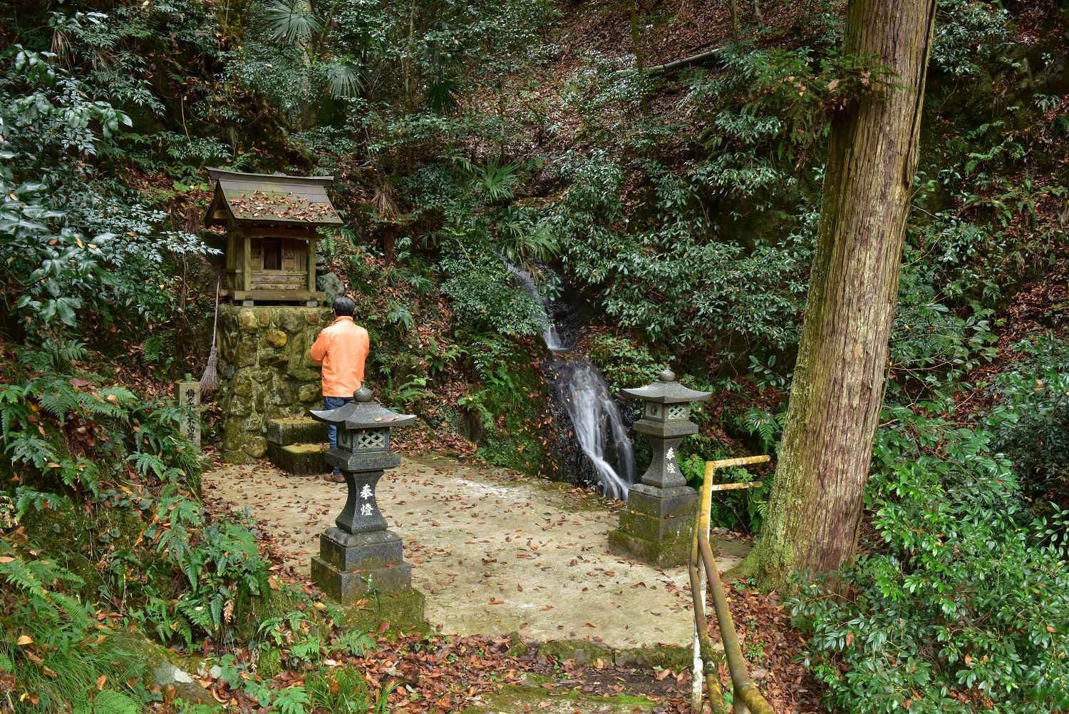 六角堂のすぐ裏に、長宮不動明王の祠と、奥に滝です。