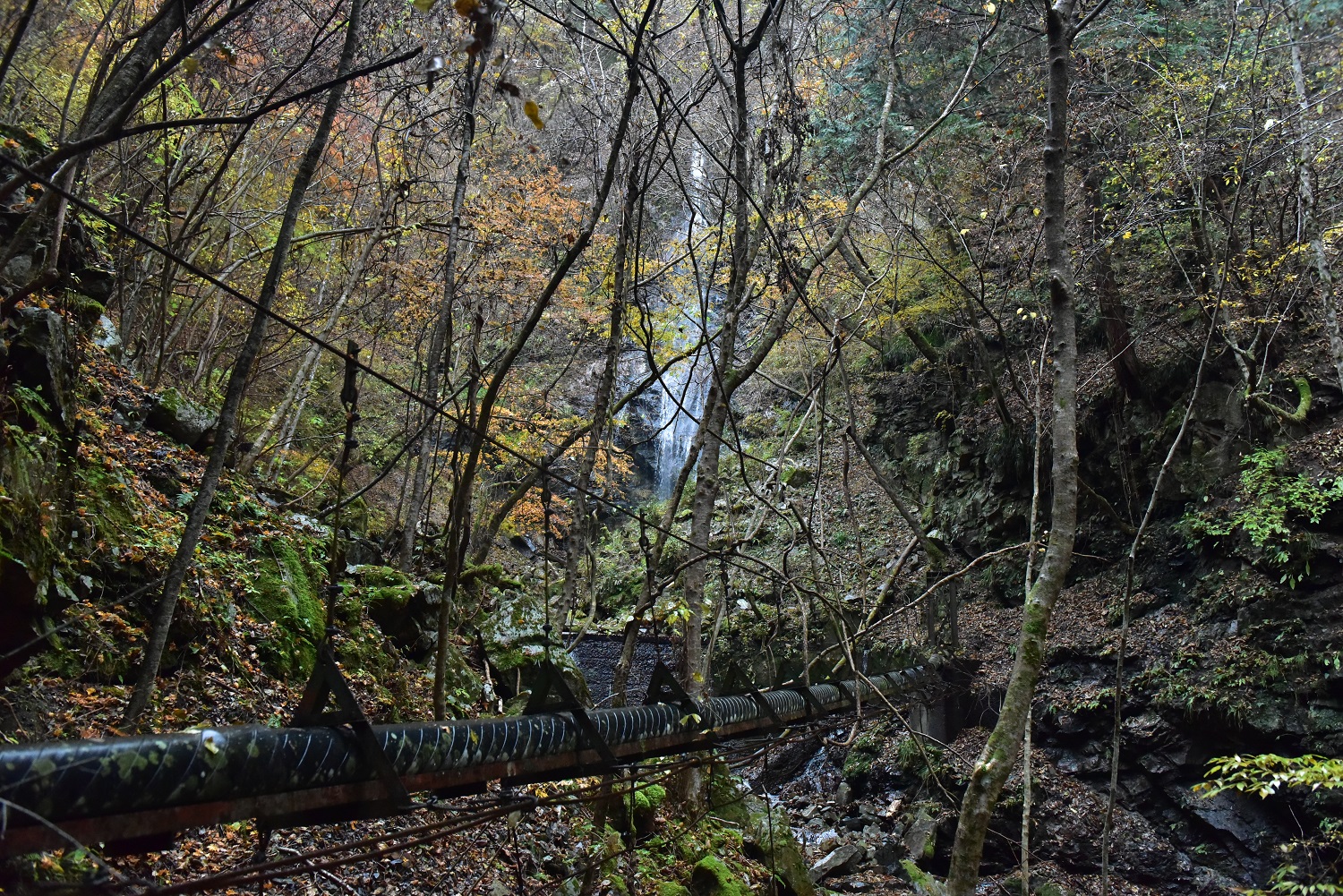 高巻いた先に人工物、その奥に予想を超えた滝が見えてきました。