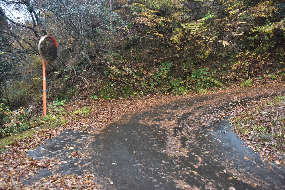 ヘアピンカーブのカーブミラーの向こうにある細い道が滝入口です。