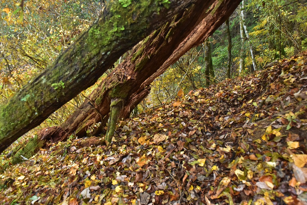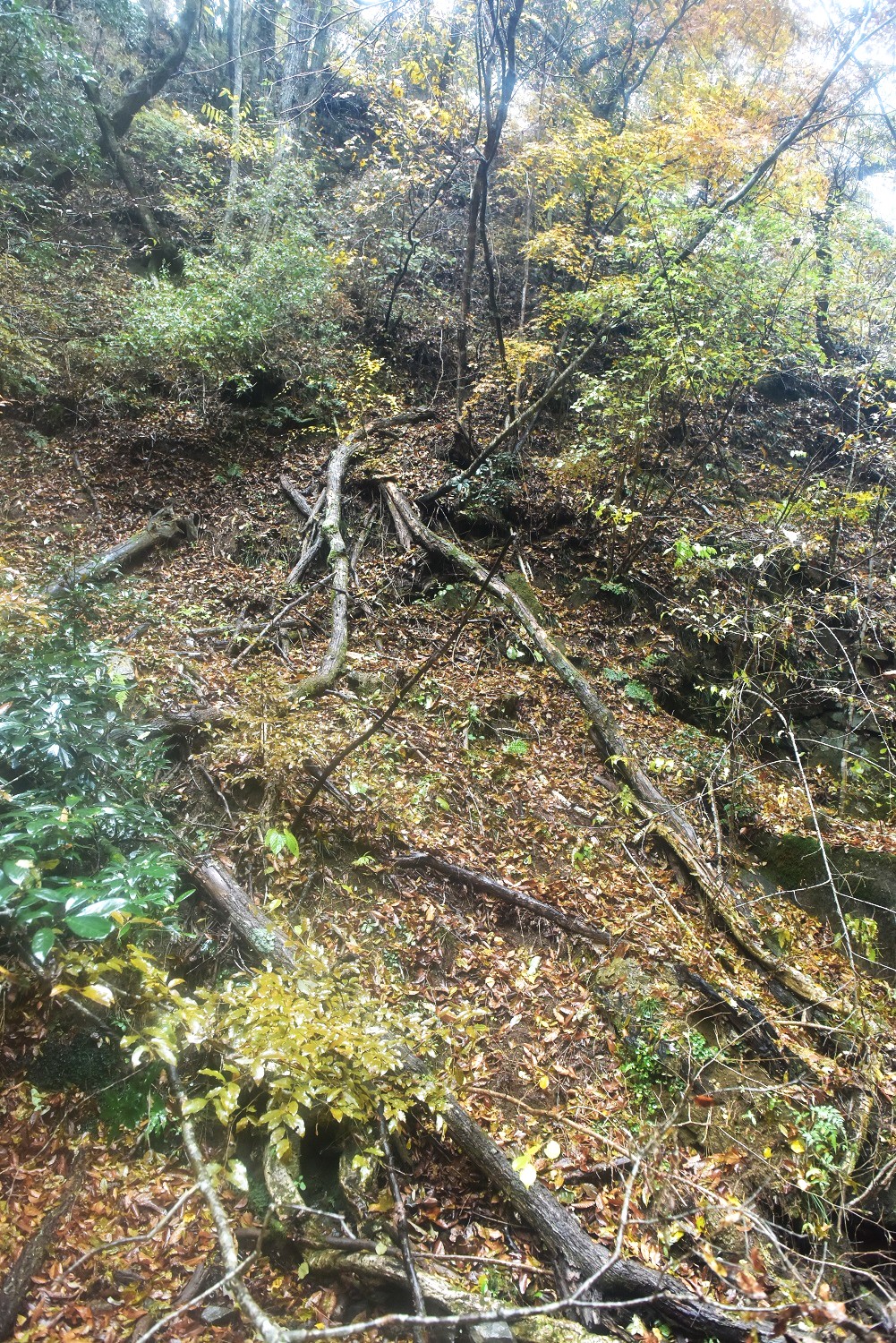 細い道を進んでいくとどんどん地盤が緩くなって、ズルッといったら掴む木もなく20mぐらい一気滑り落ちそうな場所になってきたので、
