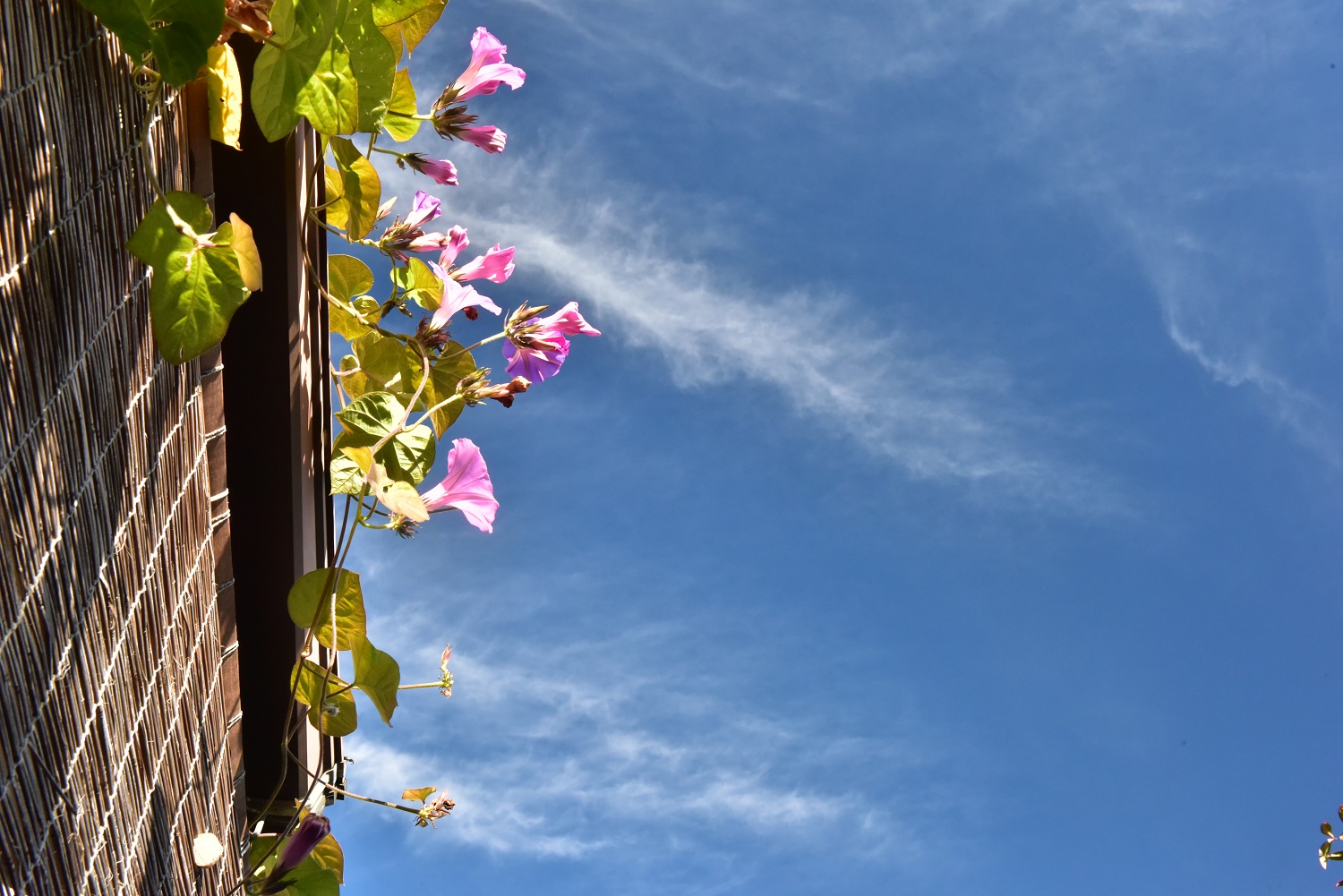 琉球朝顔が簾に絡みついていて、簾が片付けられません。