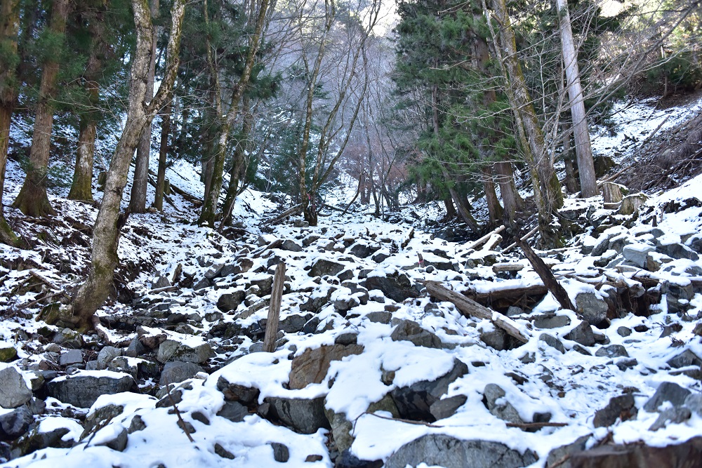 前回は入口から車で林道終点まで乗り入れたんですが、今日は無理でしたのでここから歩きました。