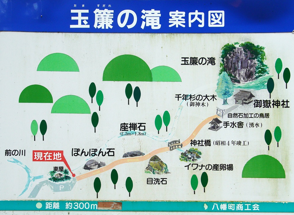 広い玉簾の滝駐車場があり、そこからよく整備された遊歩道を400mほどで御嶽神社、そしてその先に滝が落ちています。