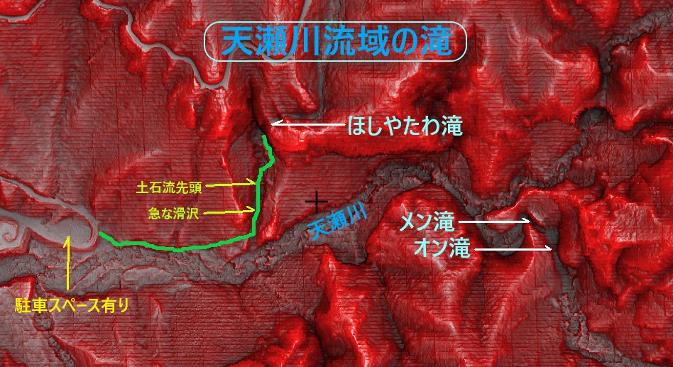 落差50m幅広斜瀑のほしやたわ滝、推定落差6m、2段斜瀑-分岐瀑のメン滝、推定落差8m滑滝のオン滝などがあります。