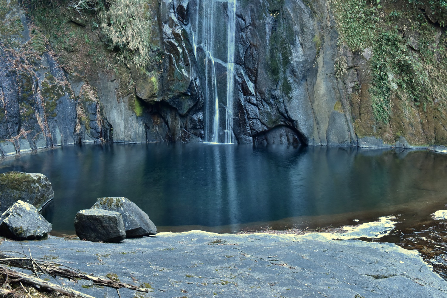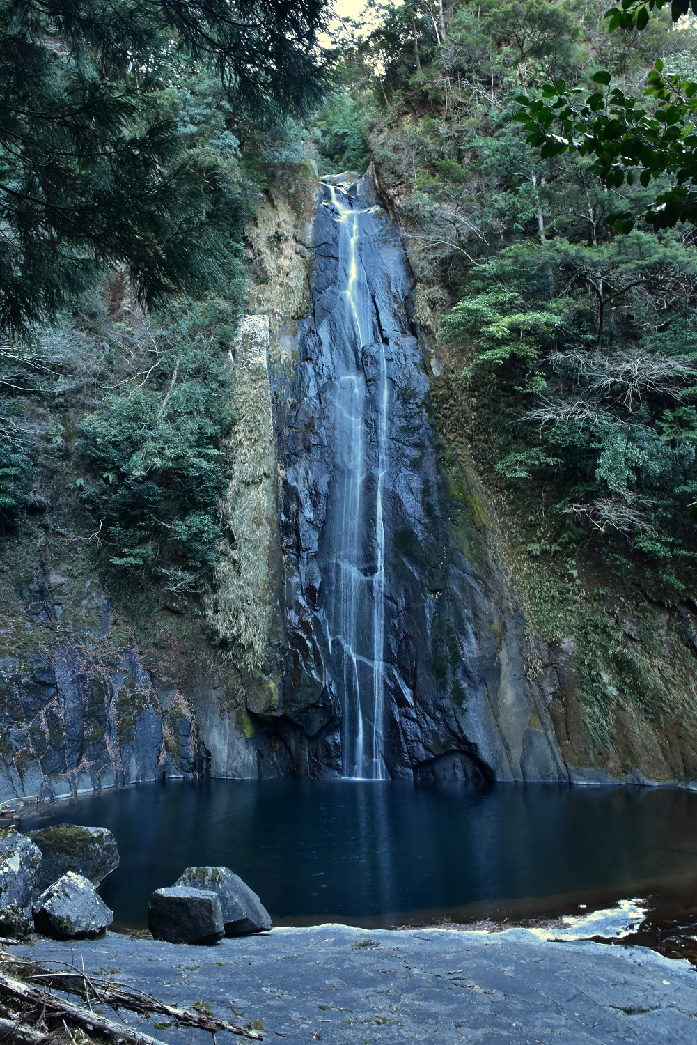 青く深い滝壺を有します。