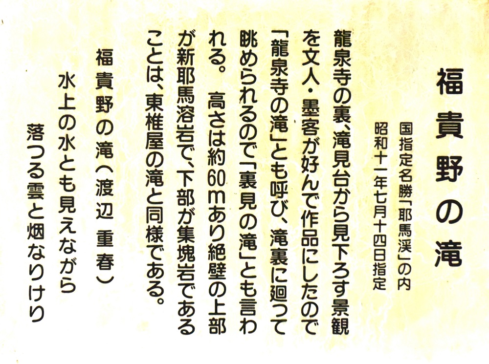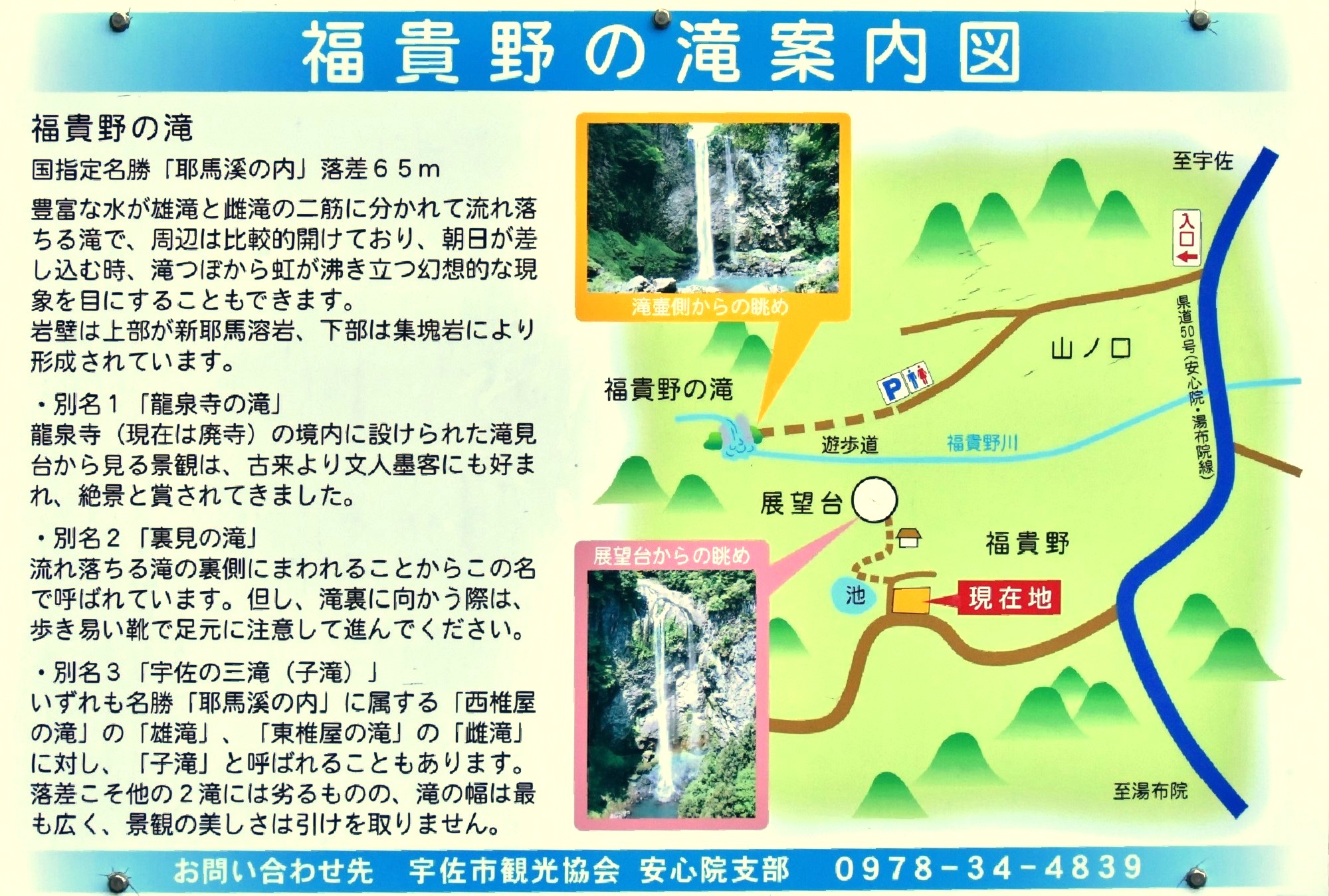 太平洋←周防(すおう)灘←駅館川←深房川←深見川に落ちる落差落差63mの多条直瀑で、裏見もできる滝です。